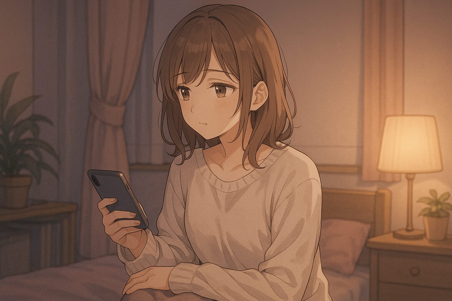 夜の自室で物思いにふける女性。スマホを手にしながら遠くを見つめ、SNSの「いいね」を気にする心理を描いた繊細なラノベ風イラスト。